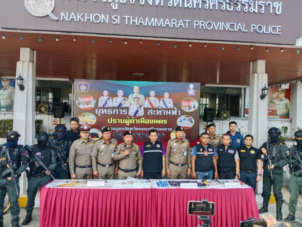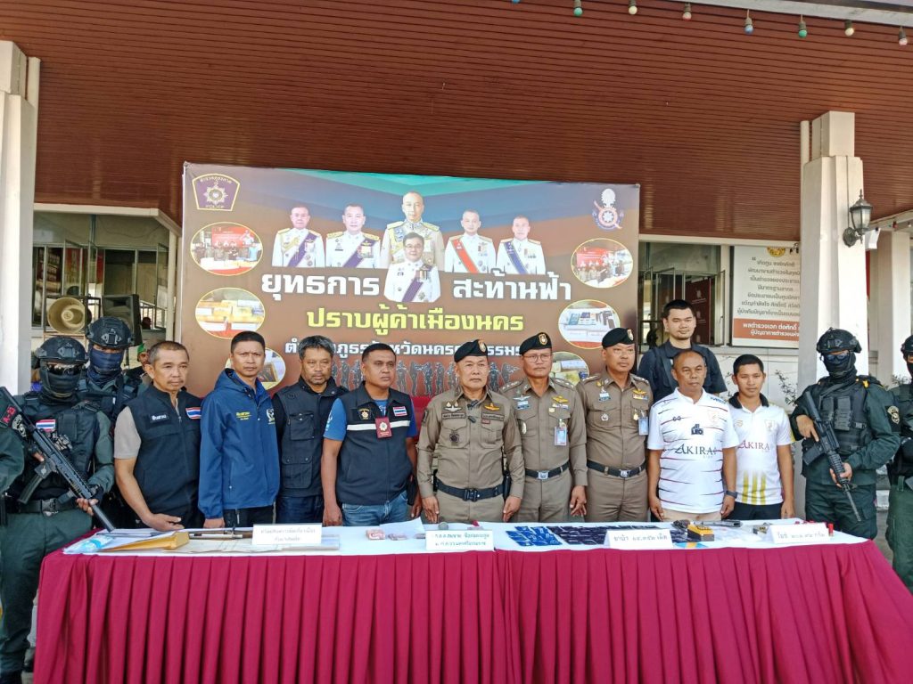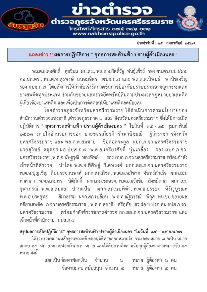 วันที่ 15 กุมภาพันธ์ 2567 เวลา 15.00 น. พล.ต.ต.สมชาย ซื่อต่อตระกูล ผบก.ภ.จว.นครศรีธรรมราช พร้อมด้วย พ.ต.อ.เกรียงศักดิ์ นุ่นเกลี้ยง รอง ผบก.ภ.จว.นครศรีธรรมราช, พ.ต.อ.นัษฐวุฒิ ทองทิพย์ รอง ผบก.ภ.จว.นครศรีธรรมราช, พ.ต.อ.สุทัศน์ สงสยม รอง ผบก.ภ.จว.นครศรีธรรมราช พร้อมด้วยชุดจับกุม สภ.สิชล และฝ่ายปกครองจังหวัดนครศรีธรรมราช ร่วมกันแถลงข่าว ผลการปฏิบัติการ ” ยุทธการสะท้านฟ้า ปราบผู้ค้าเมืองนคร ” ในวันที่ 14-15 ก.พ.67 โดยนำของกลางและทรัพย์สินที่ตรวจยึดมาทำการแถลงข่าว ณ บริเวณด้านหน้าอาคารที่ทำการ ภ.จว.นครศรีธรรมราช ในส่วนของ สภ.สิชล สามารถจับกุมผู้ต้องหาตามหมายจับได้จำนวน 5 หมาย นำส่งพนักงานสอบสวนดำเนินคดีตามกฎหมาย