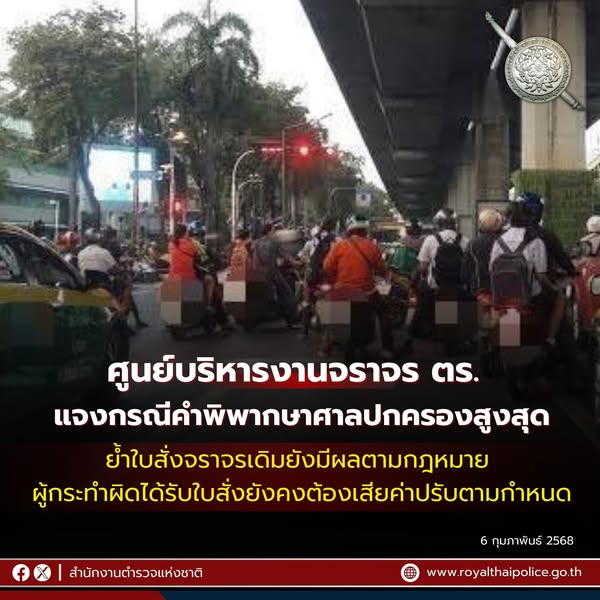 กรณีเมื่อวันที่ 5 กุมภาพันธ์ 2568 ที่ผ่านมา ศาลปกครองสูงสุดมีคำพิพากษาในคดีขอเพิกถอนประกาศสำนักงานตำรวจแห่งชาติ เรื่องกำหนดแบบใบสั่งเจ้าพนักงานจราจร พ.ศ.2563 และเรื่องการกำหนดจำนวนค่าปรับตามที่เปรียบเทียบสำหรับความผิดตาม พ.ร.บ.จราจรทางบก พ.ศ. 2522 นั้น สำนักงานตำรวจแห่งชาติขอประชาสัมพันธ์ให้ทราบว่า