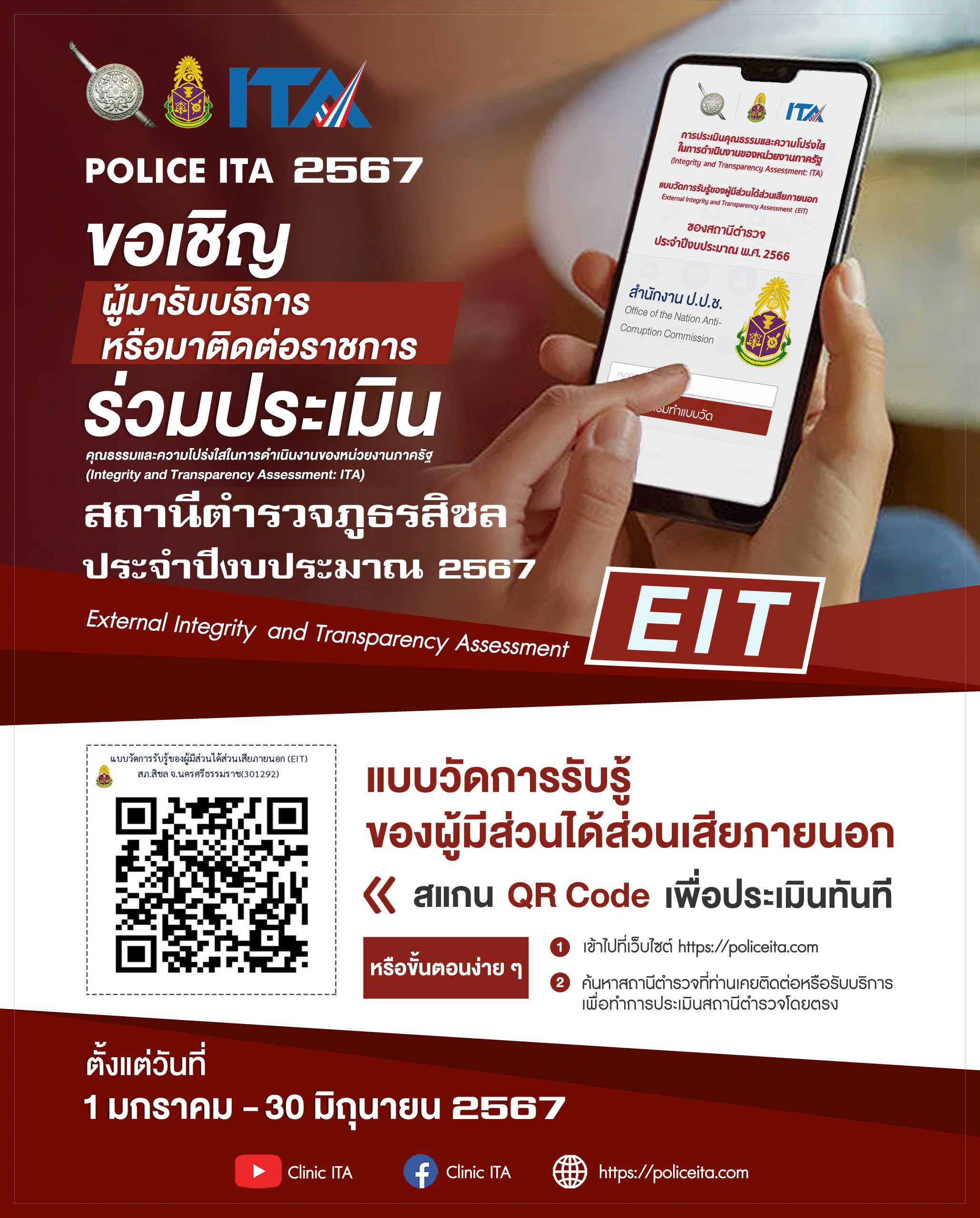 ขอเชิญประชาชนร่วมประเมินคุณธรรมและความโปร่งใส ในการดำเนินงานของหน่วยงานภาครัฐ (Integrity and Transparency Assessment : ITA 2567) ของสถานีตำรวจภูธรสิชล ประจำปีงบประมาณ 2567