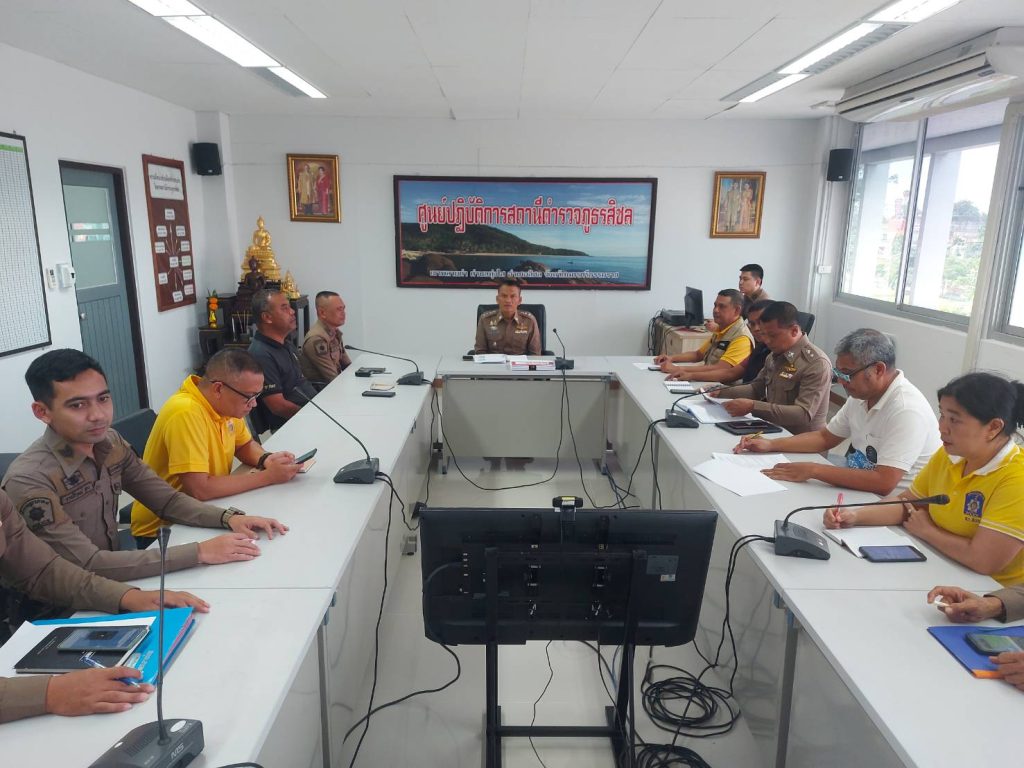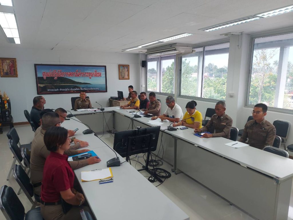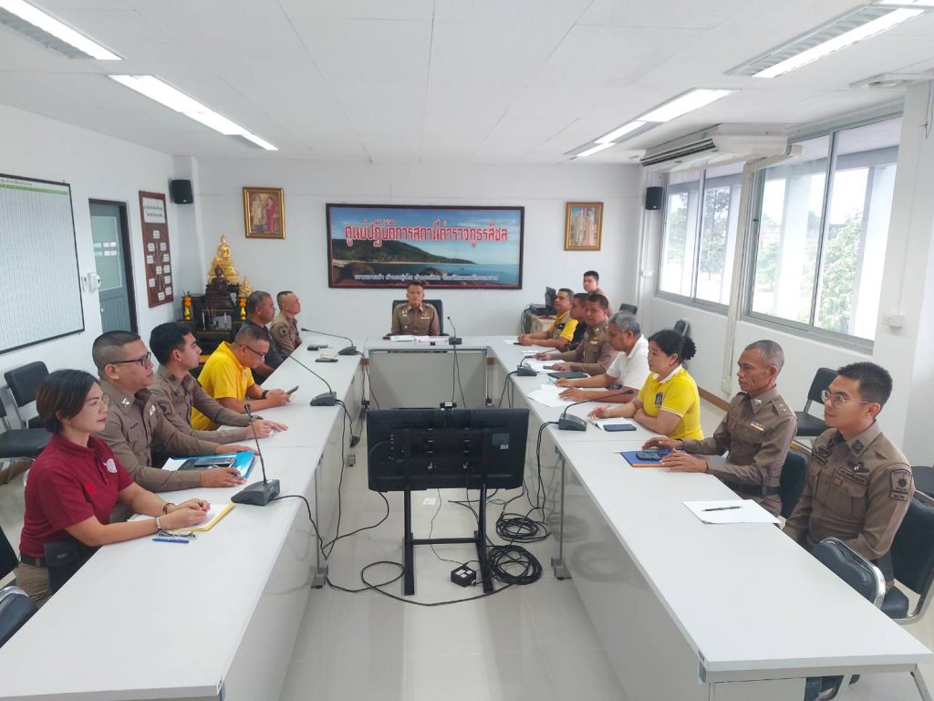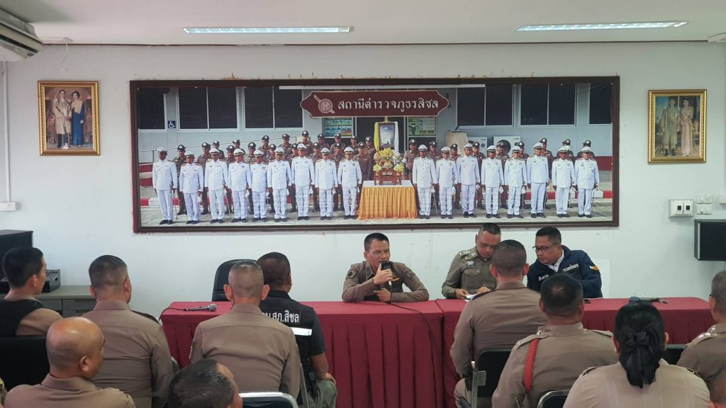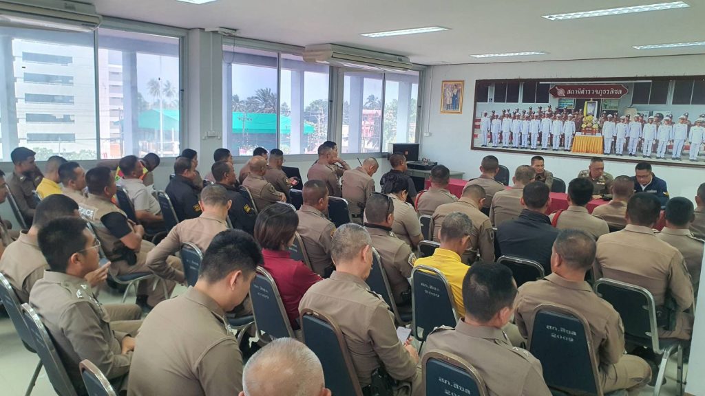 หัวหน้าสถานีตำรวจชี้แจงและให้ข้อมูลเกี่ยวกับการประเมินแก่เจ้าหน้าที่ตำรวจในหน่วยงาน